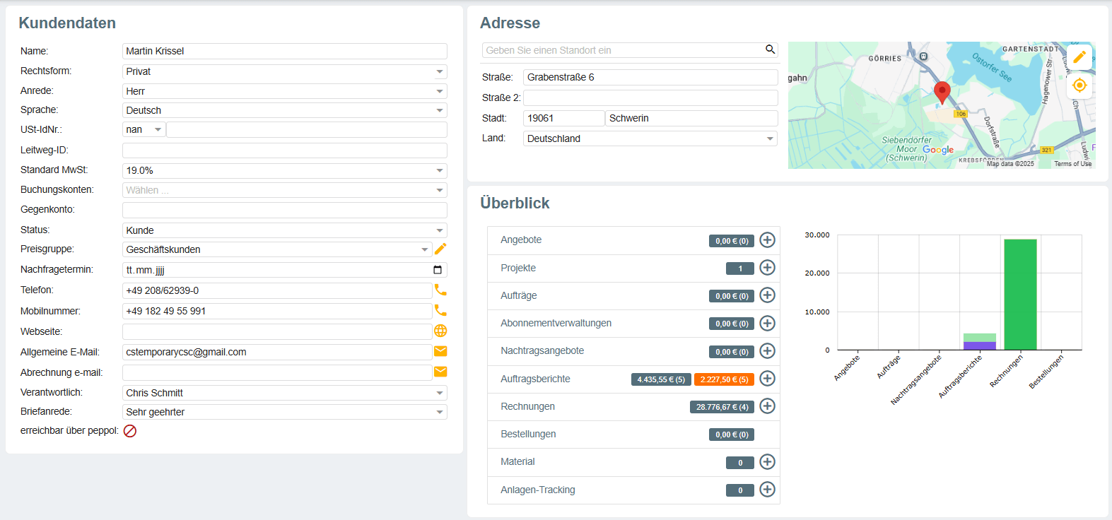 Alle Infos zu Ihren Kunden auf einen Blick: Adresse, Ansprechpartner, letzte Aufträge, offene Rechnungen sowie kundenspezifische Preise und Konditionen. Kein Zettelchaos, keine Sucherei. Außerdem können Kunden auch online unterschreiben, die Zusage sehen Sie sofort am Auftrag.