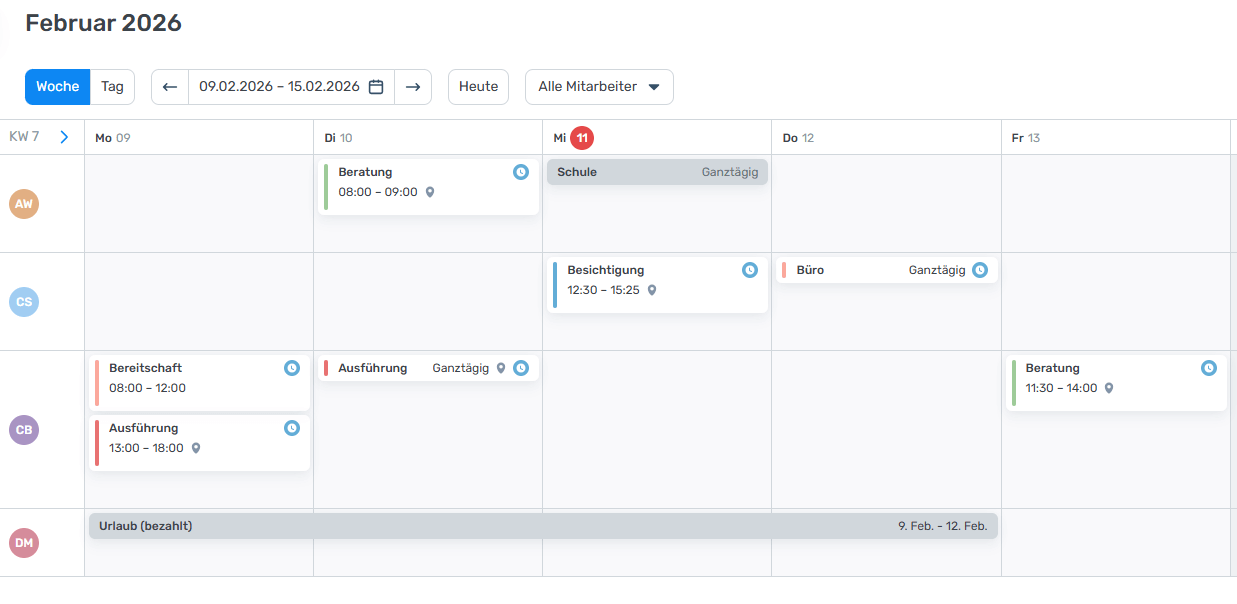 Mit der digitalen Plantafel planen Sie Aufträge, Mitarbeiter und Termine übersichtlich in der Software. Änderungen sind sofort sichtbar, Terminkonflikte werden erkannt und Fahrwege lassen sich realistisch berücksichtigen.
