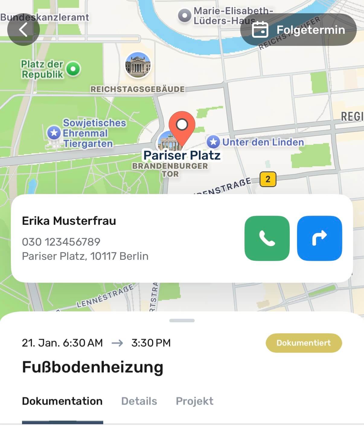 In der mobilen App von ToolTime sehen Ihre Mitarbeiter auf einen Blick, wo der nächste Einsatz ist, wer der Ansprechpartner ist und was genau zu tun ist. Dokumente, Pläne und Notizen zum Auftrag sind direkt beim Termin hinterlegt und jederzeit abrufbar. Für die Anfahrt reicht ein Klick auf den Termin, und das Smartphone zeigt direkt den Weg zum Kunden. So lässt sich der Arbeitstag mit der Handwerkersoftware vom ersten Blick in den Termin bis zur Ankunft auf der Baustelle strukturieren.